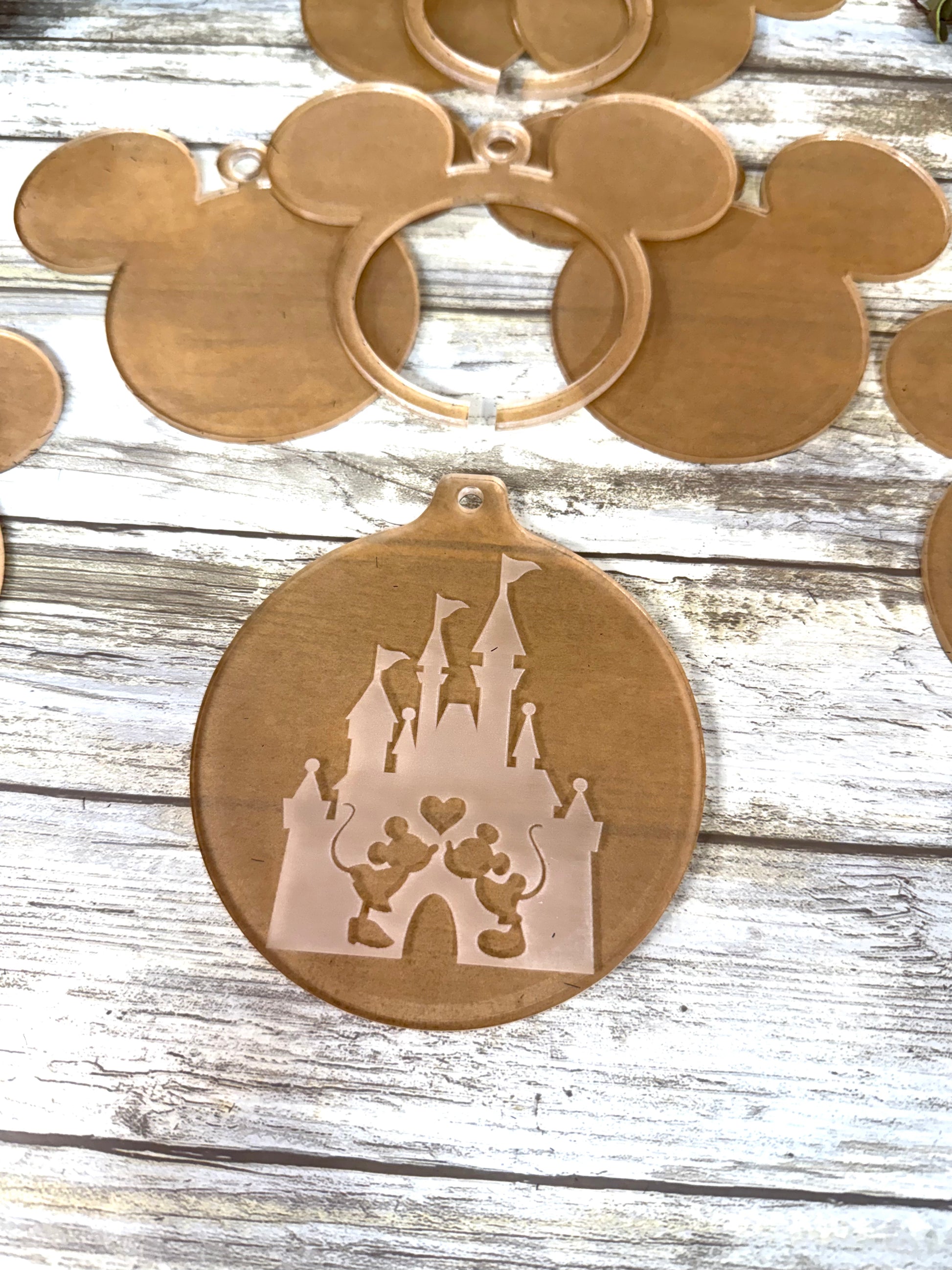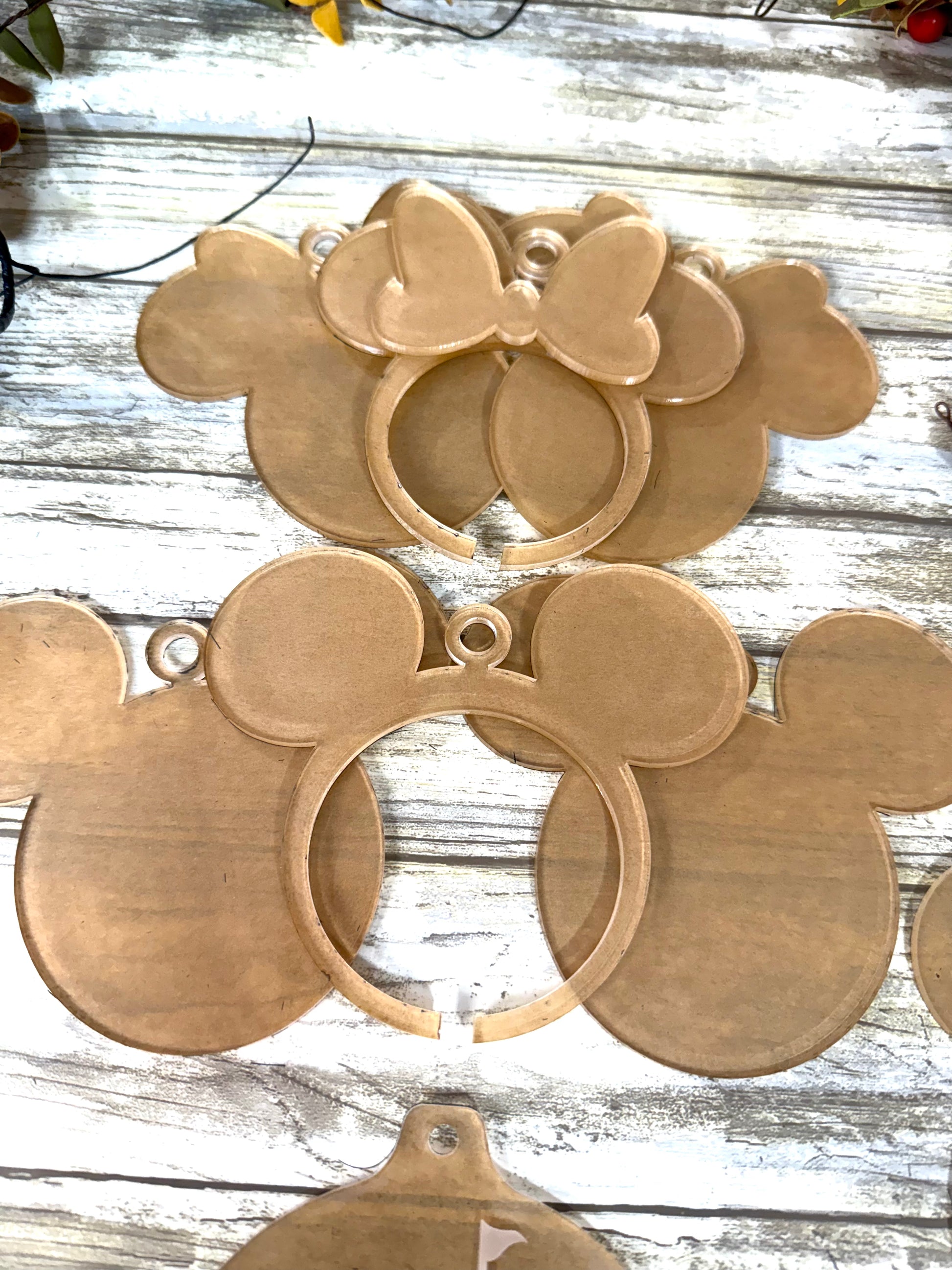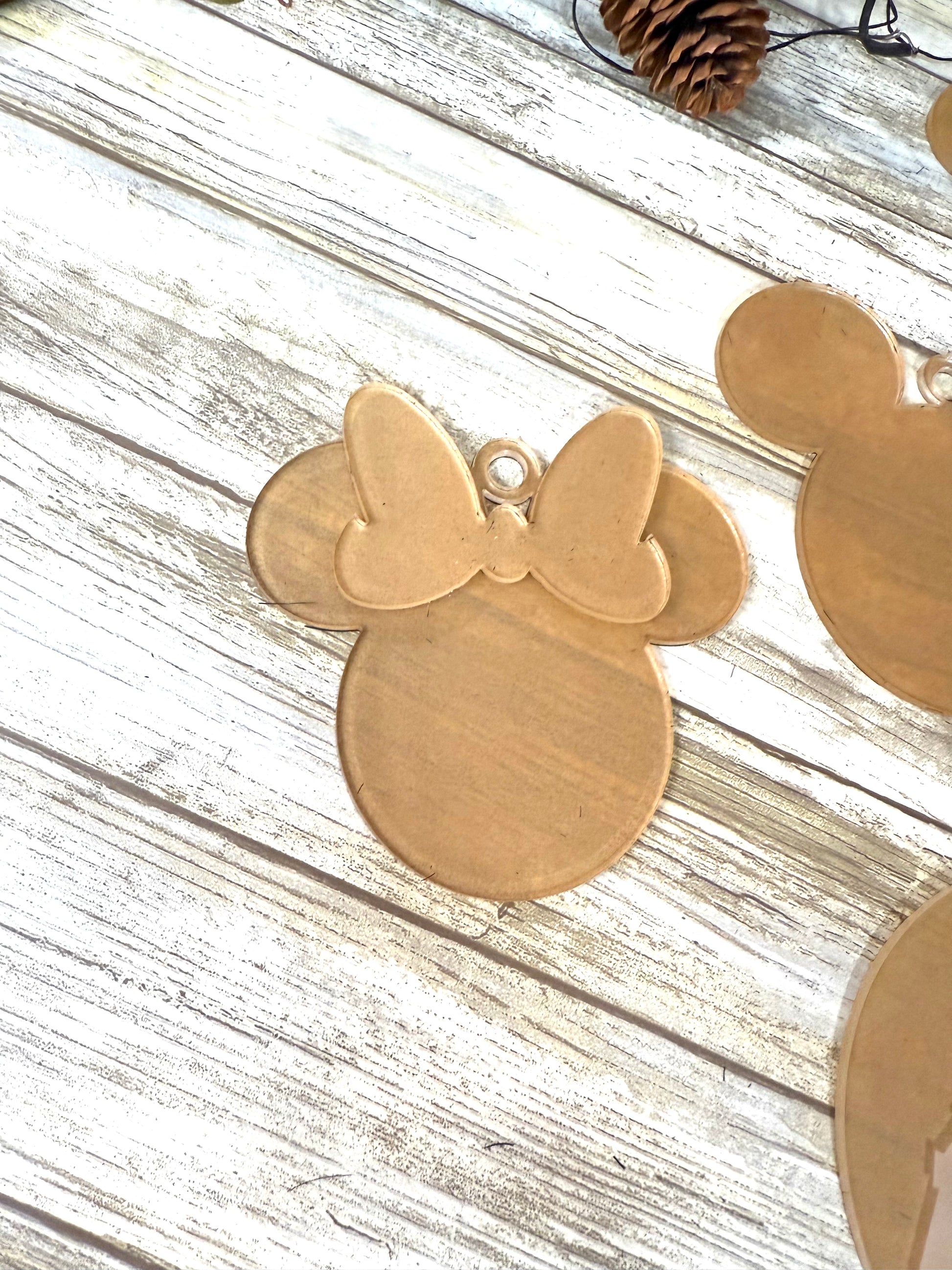 These make great Christmas ornaments! You can fill it as a snow globe with solution or use dry ingredients. They have a hole in the middle piece to fill the liquid. TIP add glitter or any dry ingredient first before you add the top piece. Kit includes 1 front piece, 1 middle cut out, 1 back piece and 1 embellishment for Minn only. The single round ornament or Mick/Minn shape ones are also 4 inches. The Minn one comes with the bow embellishment. Each one is laser cut out on 1/8 acrylic and has a hole at the top. They will be shipped with the backing on one or both sides.